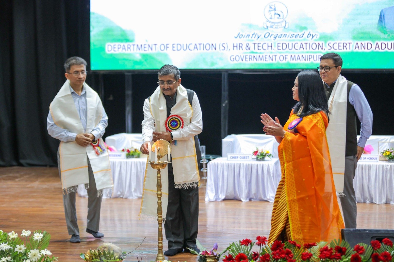 Dr. Puneet Kumar Goel, IAS, Chief Secretary, Government of Manipur, attended the event as Chief Guest. R.K. Dinesh Singh, IAS, Principal Secretary (Higher and Technical Education/SCERT/Adult Education/AR/MAHUD) and Commissioner (Education), presided over the function as President, while Naorem Praveen Singh, IAS, Secretary (Education-S/YAS/OBC & SC/MA), attended as a dais member.