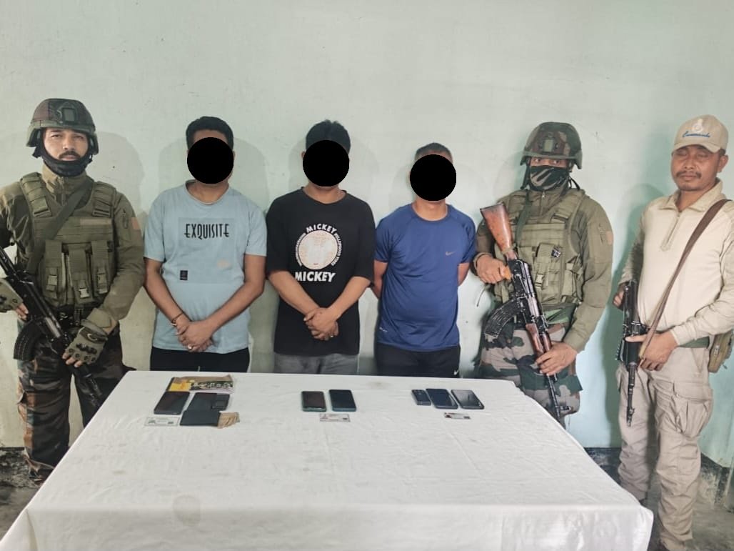 On Thursday, three active cadres of KCP (PWG), allegedly involved in extortion and issuing threats to the public, shopkeepers, and bank employees in valley areas, were arrested.