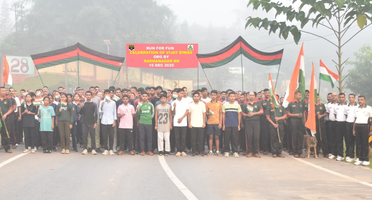 Agartala, December 16, 2025: To commemorate Vijay Diwas and honour India’s historic victory in the 1971 war, Assam Rifles organised a ‘Run for Fun’ at Radhanagar on Tuesday. The event drew enthusiastic participation from Assam Rifles personnel, local residents and students, showcasing a strong spirit of patriotism and collective respect for the nation’s brave soldiers.