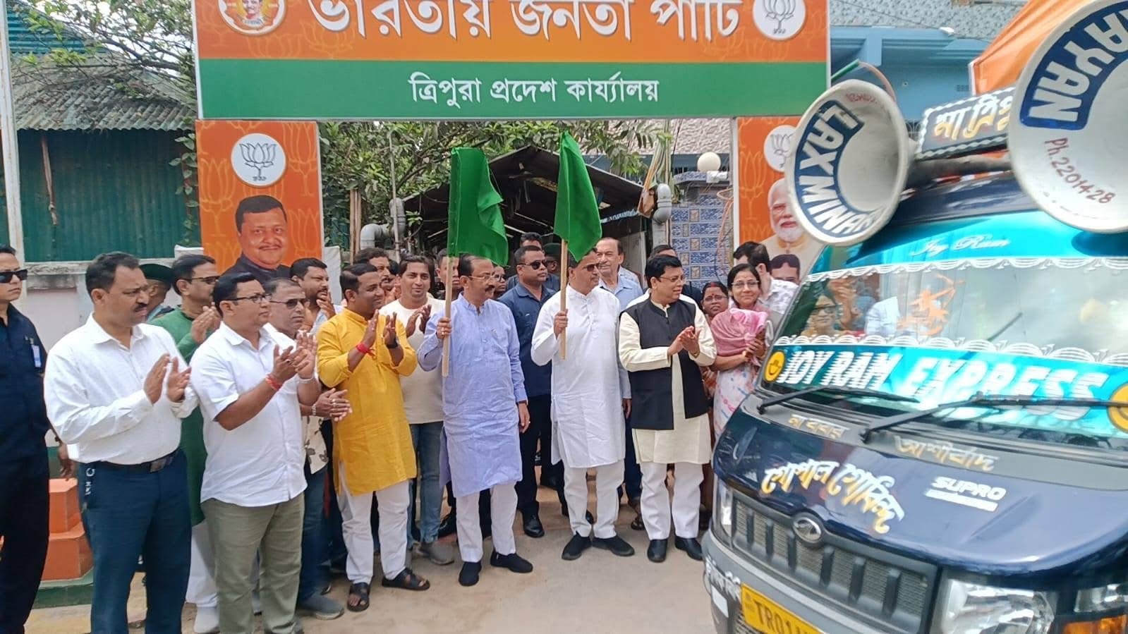 The campaign vehicle was flagged off by Bhattacharjee, marking the formal launch of the party’s outreach drive across the Tripura Tribal Areas Autonomous District Council (TTAADC) constituencies.