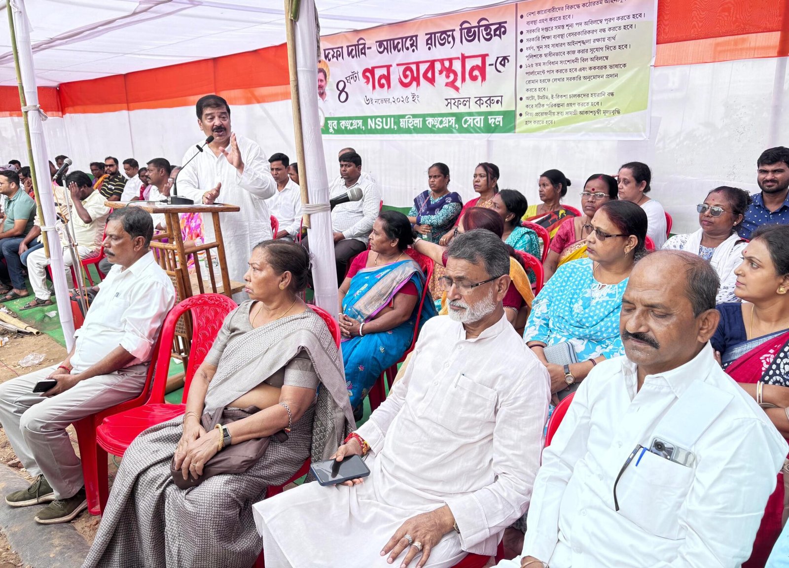 Agartala, November 06, 2025: The Tripura Pradesh Youth Congress, Tripura Mahila Congress, NSUI and Seva Dal staged a statewide sit-in protest at Radhanagar Bus Stand on Thursday, pressing for the immediate fulfillment of a seven-point charter of demands.