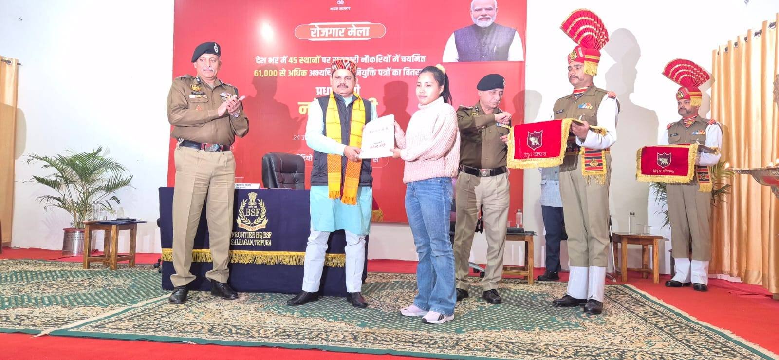 Agartala, January 24, 2026: As part of the 18th nationwide Rozgar Mela, an employment fair was organized at the Border Security Force (BSF) Frontier Headquarters in Shalbagan, Tripura. Union Minister of State for Coal and Mines, Satish Chandra Dubey on Saturday handed over appointment letters to 174 candidates selected for various uniformed services.