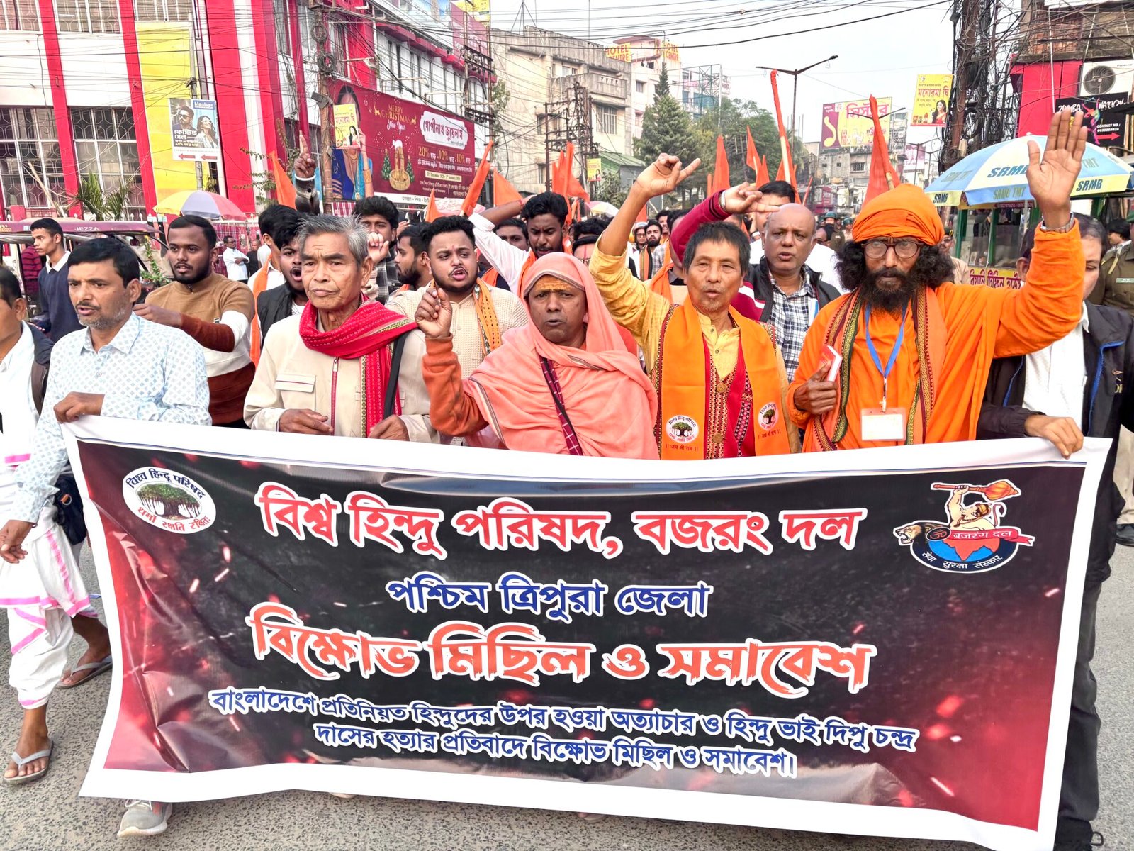 Agartala, December 24, 2025: Agartala witnessed a protest march on Wednesday organized by the Vishwa Hindu Parishad (VHP) and Bajrang Dal, condemning the alleged continuous persecution of minority Hindus in Bangladesh and the recent killing of Hindu youth Dipu Chandra Das.